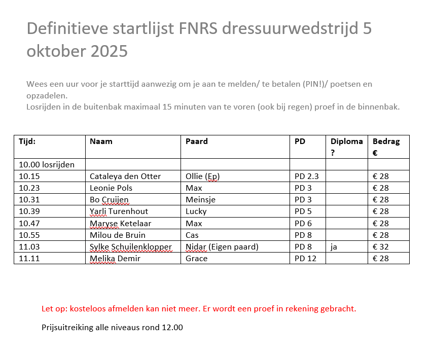 Afmelden kan kosteloos t/m de woensdag vóór de wedstrijd via info@manege-voorst.nl daarna wordt het te betalen bedrag in rekening gebracht bij de ruiter.