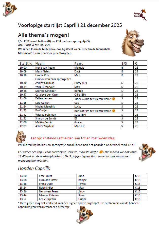Hierbij de voorlopige startlijst voor de Caprilli wedstrijd van 21/12 2025
